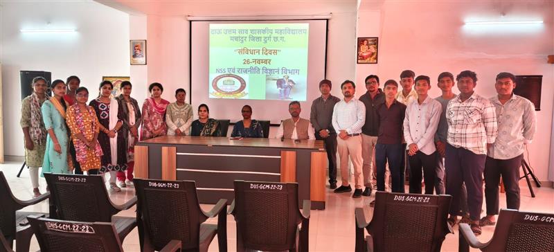दाऊ उत्तम साव शासकीय महाविद्यालय मचांदुर जिला दुर्ग छत्तीसगढ़ में राष्ट्रीय सेवा योजना एवं राजनीति विज्ञान विभाग के संयुक्त तत्वाधान में दिनांक 26 नवंबर 2025 को संविधान दिवस पर कार्यक्रमों का आयोजन किया गया। इस कार्यक्रम में संविधान की उद्देशिका का वाचन, शपथ ग्रहण, प्रश्न मंच एवं व्याख्यान आयोजित किए गए। महाविद्यालय की प्राचार्य डॉ संगीता मेहूरिया के मार्गदर्शन में स्वयंसेवकों एवं प्राध्यापकों द्वारा संविधान की प्रस्तावना का वाचन किया गया। संविधान में निहित मौलिक अधिकारों एवं मौलिक कर्तव्यों पर प्रकाश डालते हुए महाविद्यालय की प्राचार्य डॉ संगीता ने कहा कि मौलिक कर्तव्यों के प्रति हमारी जवाबदारी ही हमारे मौलिक अधिकारों का रक्षण करती है। समाजशास्त्र के प्राध्यापक श्री नीलम संजीव एक्का ने पावर पॉइंट प्रेजेंटेशन के माध्यम से विद्यार्थियो को संविधान की आवश्यकता, निर्माण से लेकर अंगीकरण तक की जानकारी बड़े ही रोचक तरीके से प्रदान की। कार्यक्रम का संचालन डॉ रामेश्वरी दास ने किया। कार्यक्रम में डॉ कल्याणी, राष्ट्रीय सेवा योजना इकाई के कार्यक्रम अधिकारी श्री विकास कुमार, वर्षा वर्मा, जागृति चंद्राकर, श्री मुकेश सिन्हा, पूजा सोनी सहित बड़ी संख्या में विद्यार्थी गण उपस्थित रहे।