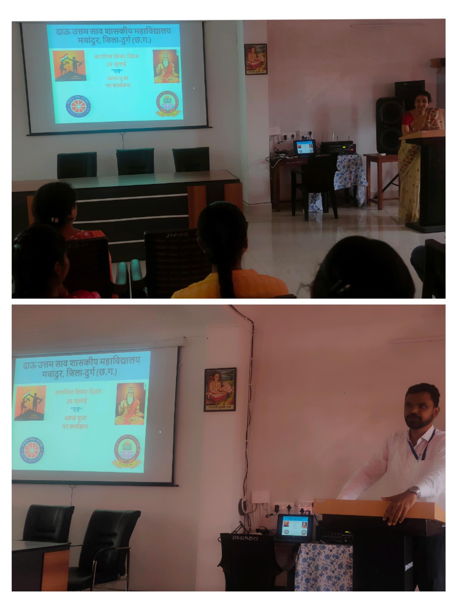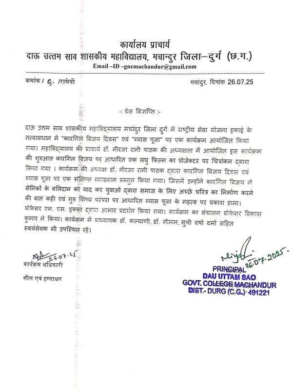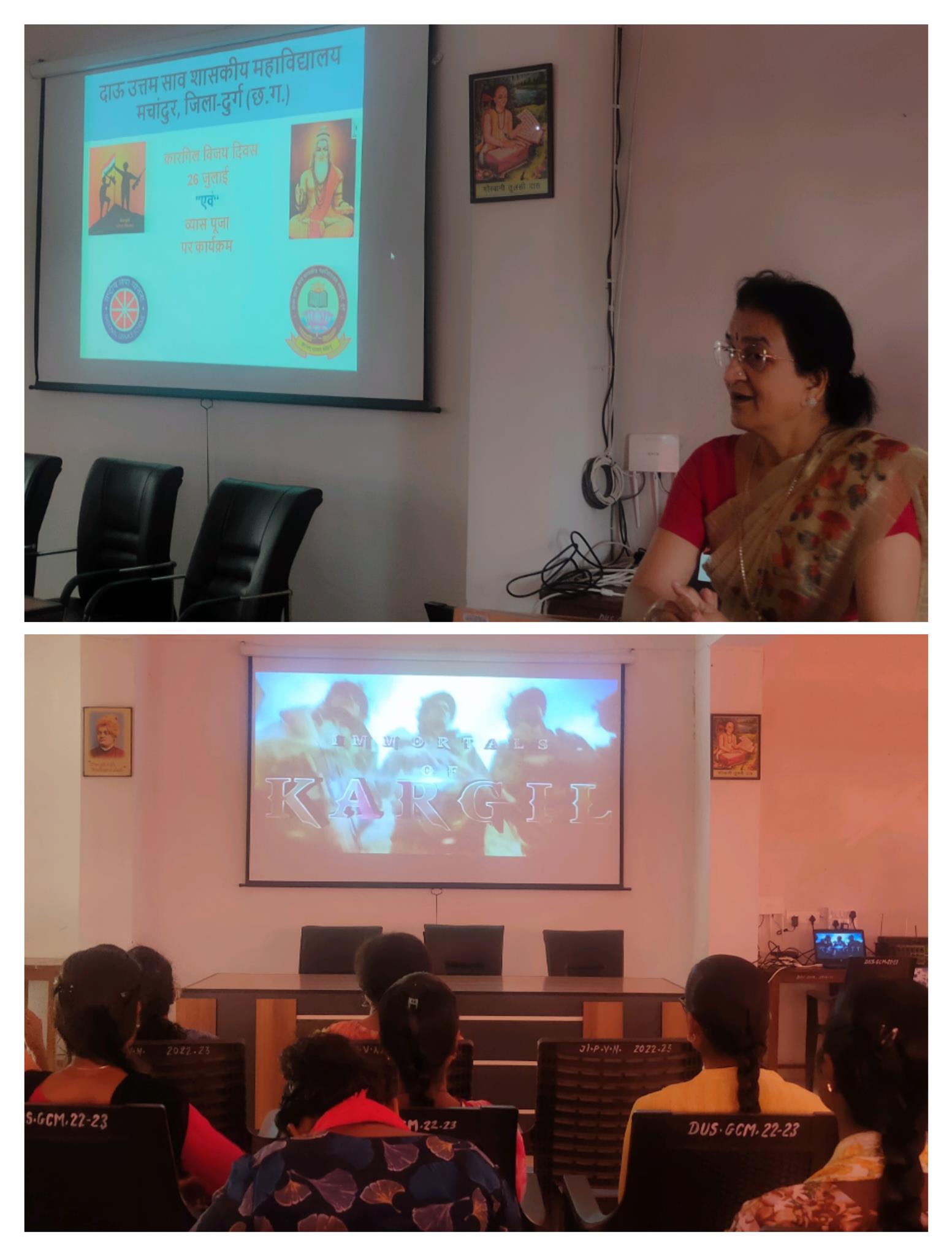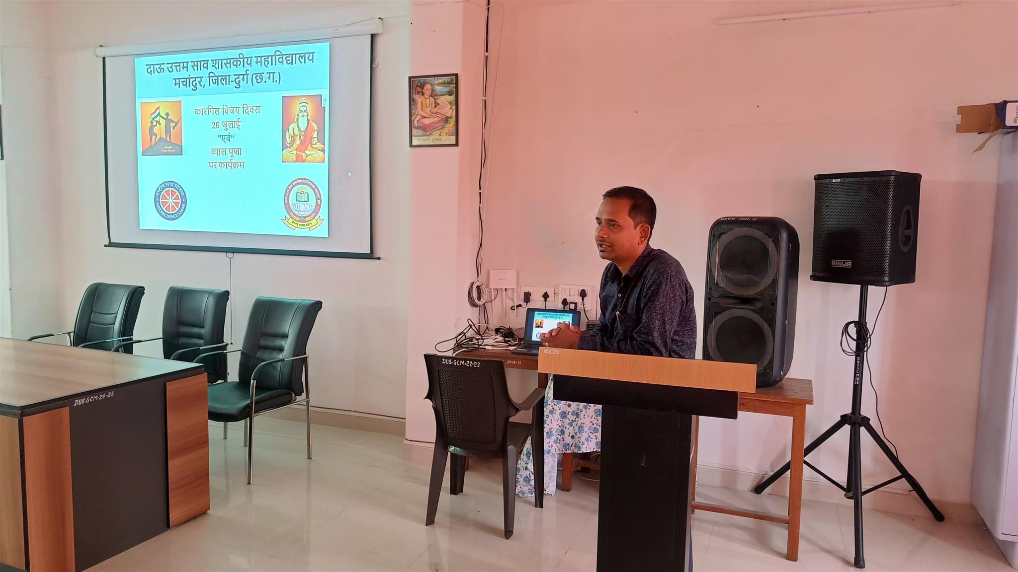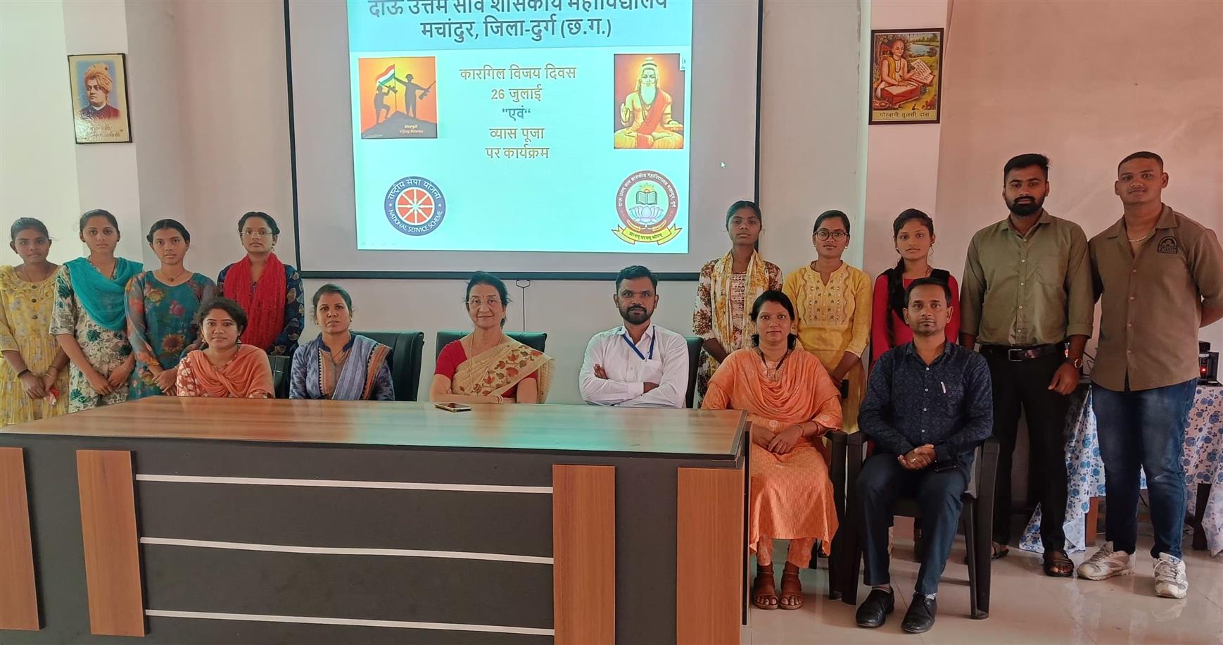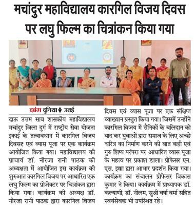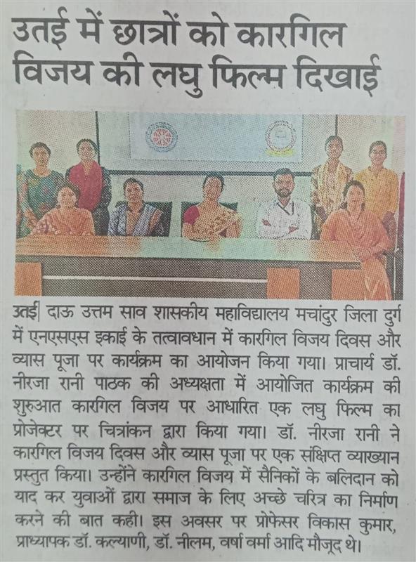 दाऊ उत्तम साव शासकीय महाविद्यालय मचांदुर जिला दुर्ग में राष्ट्रीय सेवा योजना इकाई के तत्वावधान में "कारगिल विजय दिवस" एवं "व्यास पूजा" पर एक कार्यक्रम आयोजित किया गया। महाविद्यालय की प्राचार्य डॉ. नीरजा रानी पाठक की अध्यक्षता में आयोजित इस कार्यक्रम की शुरुआत कारगिल विजय पर आधारित एक लघु फिल्म का प्रोजेक्टर पर चित्रांकन द्वारा किया गया । कार्यक्रम की अध्यक्ष डॉ. नीरजा रानी पाठक द्वारा कारगिल विजय दिवस एवं व्यास पूजा पर एक संक्षिप्त व्याख्यान प्रस्तुत किया गया। जिसमें उन्होंने कारगिल विजय में सैनिकों के बलिदान को याद कर युवाओं द्वारा समाज के लिए अच्छे चरित्र का निर्माण करने की बात कही एवं गुरु शिष्य परंपरा पर आधारित व्यास पूजा के महत्व पर प्रकाश डाला। प्रोफेसर एन. एस. इक्का द्वारा आभार प्रदर्शन किया गया। कार्यक्रम का संचालन प्रोफेसर विकास कुमार ने किया। कार्यक्रम में प्राध्यापक डॉ. कल्याणी, डॉ. नीलम, सुश्री वर्षा वर्मा सहित स्वयंसेवक भी उपस्थित रहे।