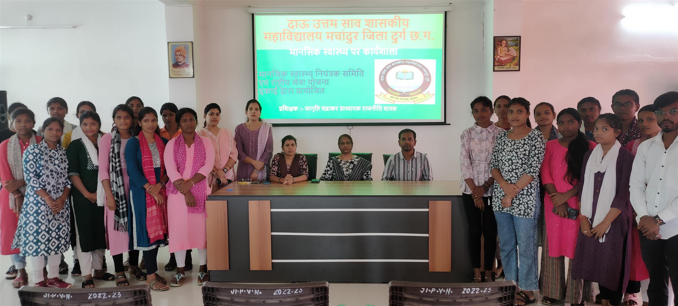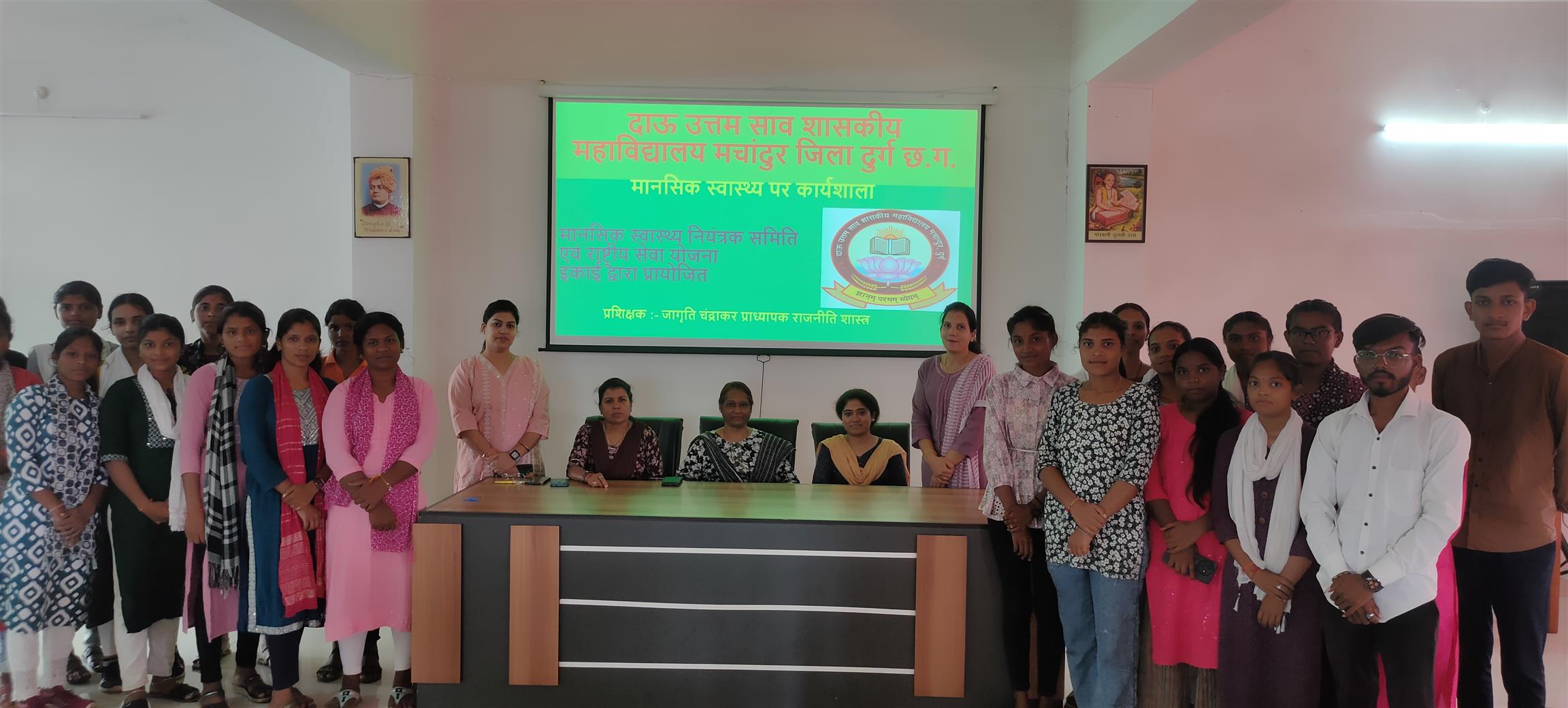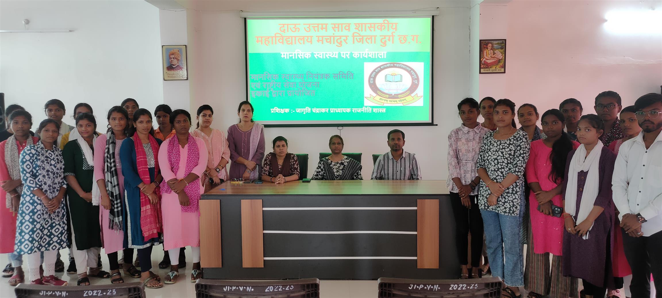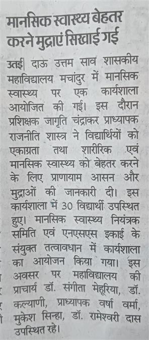 दाऊ उत्तम साव शासकीय महाविद्यालय मचांदुर जिला दुर्ग में मानसिक स्वास्थ्य नियंत्रक समिति एवं राष्ट्रीय सेवा योजना इकाई के संयुक्त तत्वावधान में मानसिक स्वास्थ्य पर एक कार्यशाला आयोजित की गई। इस कार्यशाला में महाविद्यालय की प्राचार्य डॉ. संगीता मेहूरिया, डॉ.कल्याणी, प्राध्यापक वर्षा वर्मा, श्री मुकेश सिन्हा, डॉ. रामेश्वरी दास उपस्थित रहे। मानसिक स्वास्थ्य पर आधारित इस कार्यशाला में प्रशिक्षक जागृति चंद्राकर प्राध्यापक राजनीति शास्त्र ने विद्यार्थियों को एकाग्रता तथा शारीरिक एवं मानसिक स्वास्थ्य को बेहतर करने हेतु प्राणायाम आसन एवं मुद्राओं की जानकारी दी। इस कार्यशाला में 30 विद्यार्थी उपस्थित हुए।