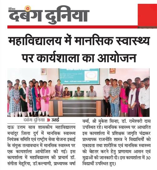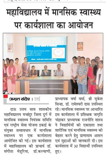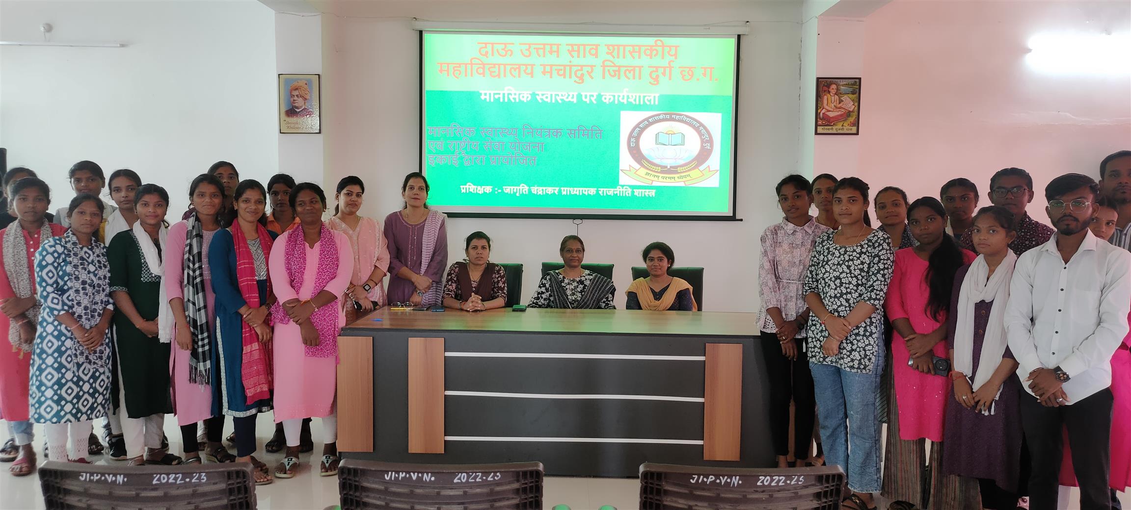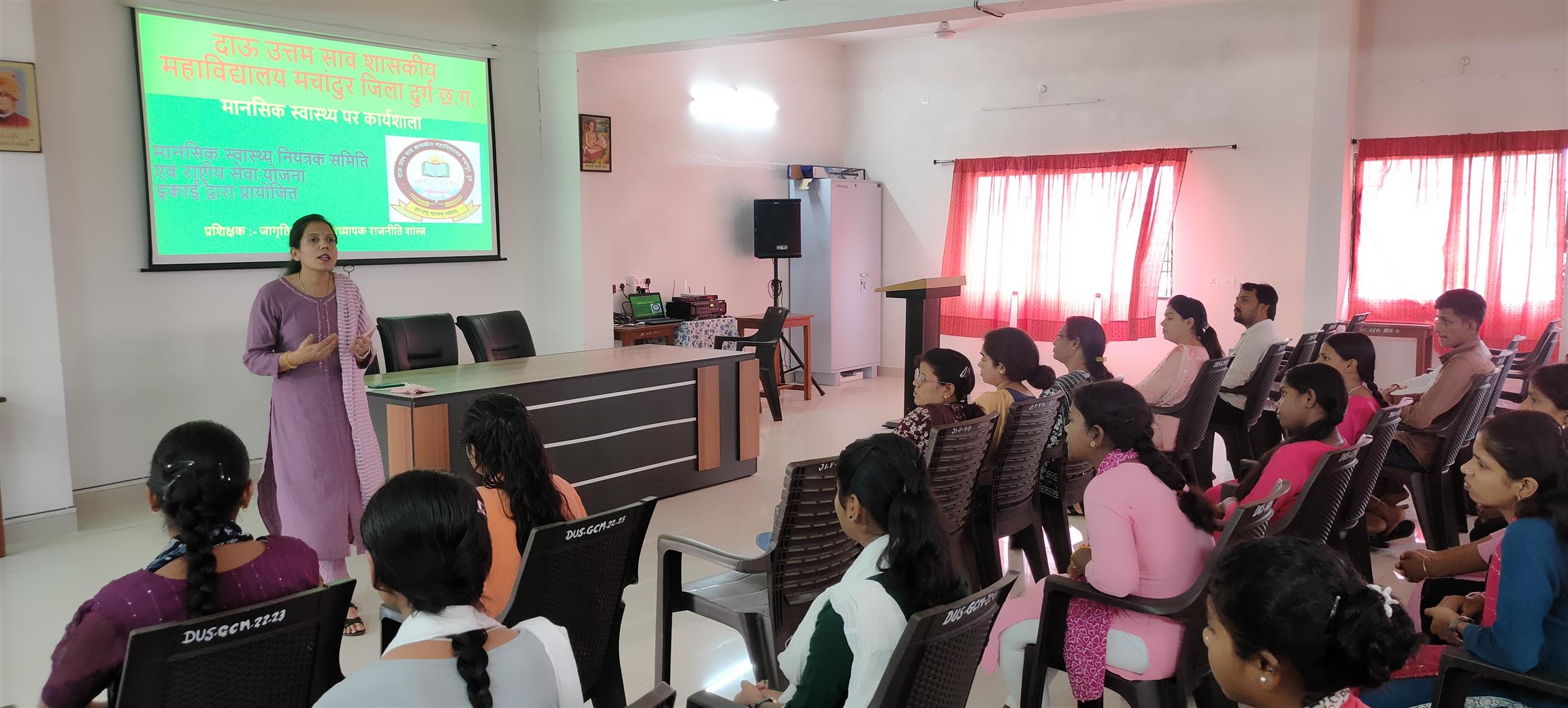 दाऊ उत्तम साव शासकीय महाविद्यालय मचांदुर जिला दुर्ग में मानसिक स्वास्थ्य नियंत्रक समिति एवं राष्ट्रीय सेवा योजना इकाई के संयुक्त तत्वावधान में मानसिक स्वास्थ्य पर एक कार्यशाला आयोजित की गई। इस कार्यशाला में महाविद्यालय की प्राचार्य डॉ. संगीता मेहूरिया, डॉ.कल्याणी, प्राध्यापक वर्षा वर्मा, श्री मुकेश सिन्हा, डॉ. रामेश्वरी दास उपस्थित रहे। मानसिक स्वास्थ्य पर आधारित इस कार्यशाला में प्रशिक्षक जागृति चंद्राकर प्राध्यापक राजनीति शास्त्र ने विद्यार्थियों को एकाग्रता तथा शारीरिक एवं मानसिक स्वास्थ्य को बेहतर करने हेतु प्राणायाम आसन एवं मुद्राओं की जानकारी दी। इस कार्यशाला में 30 विद्यार्थी उपस्थित हुए।