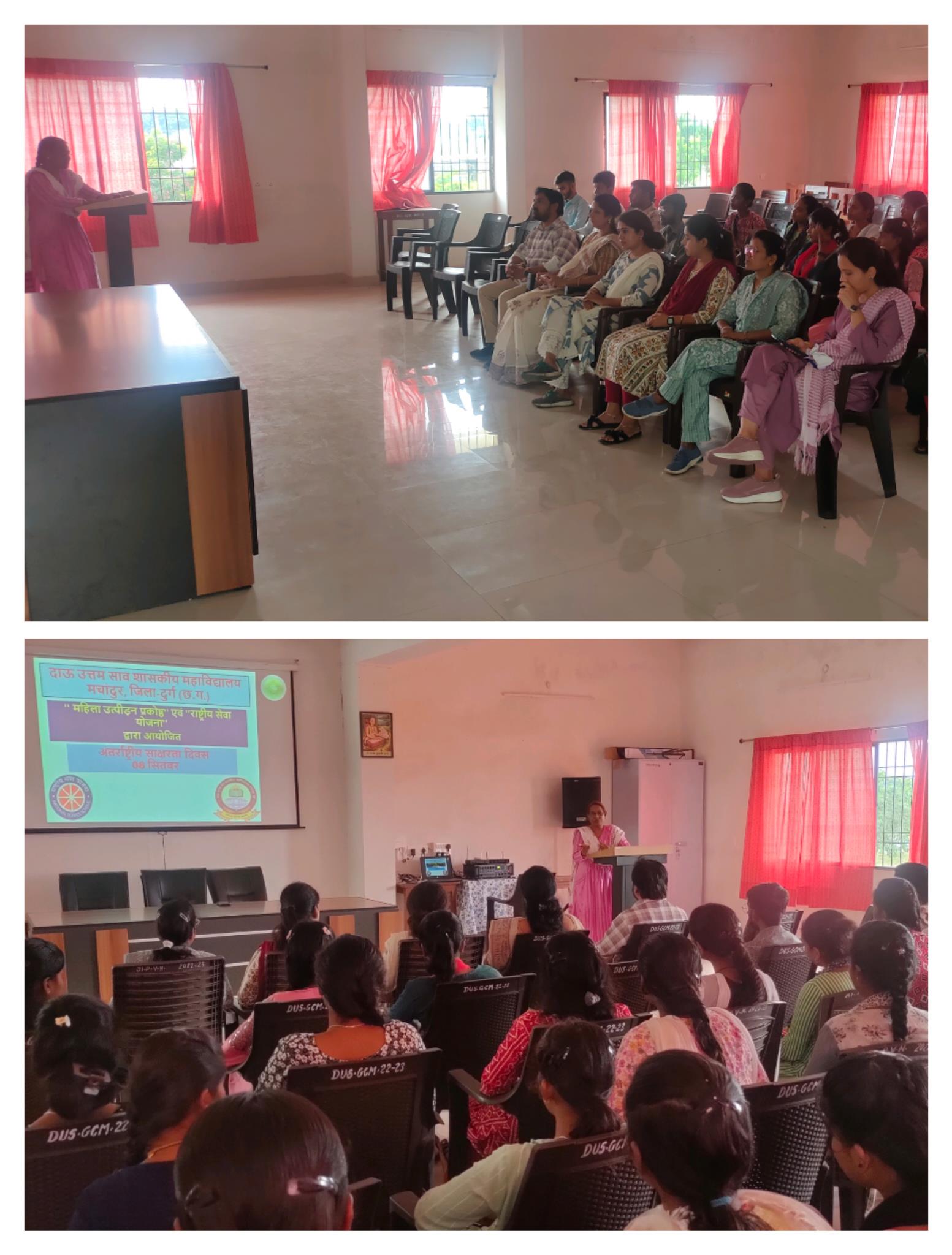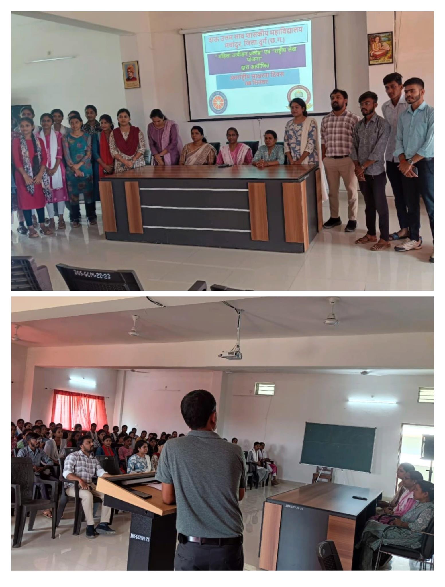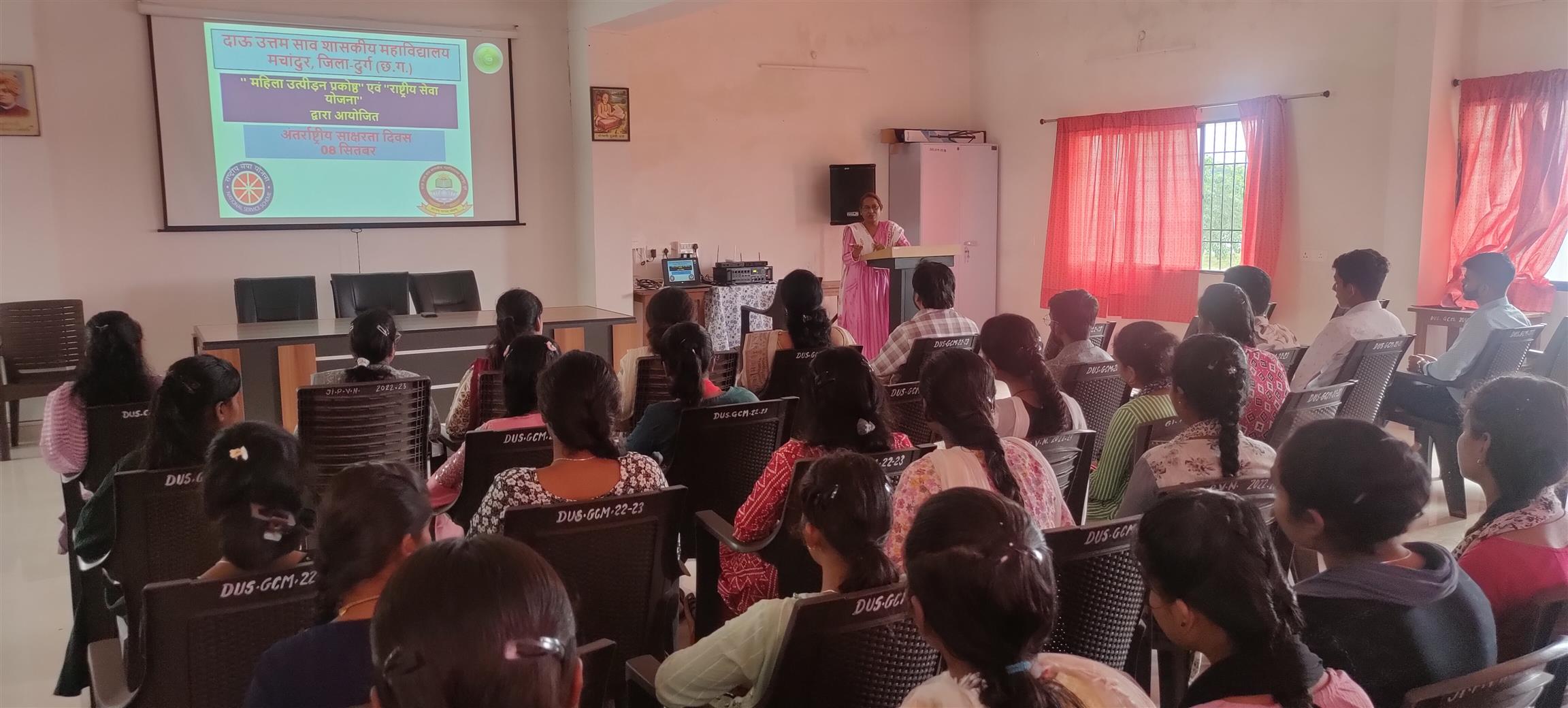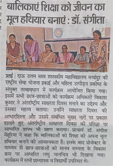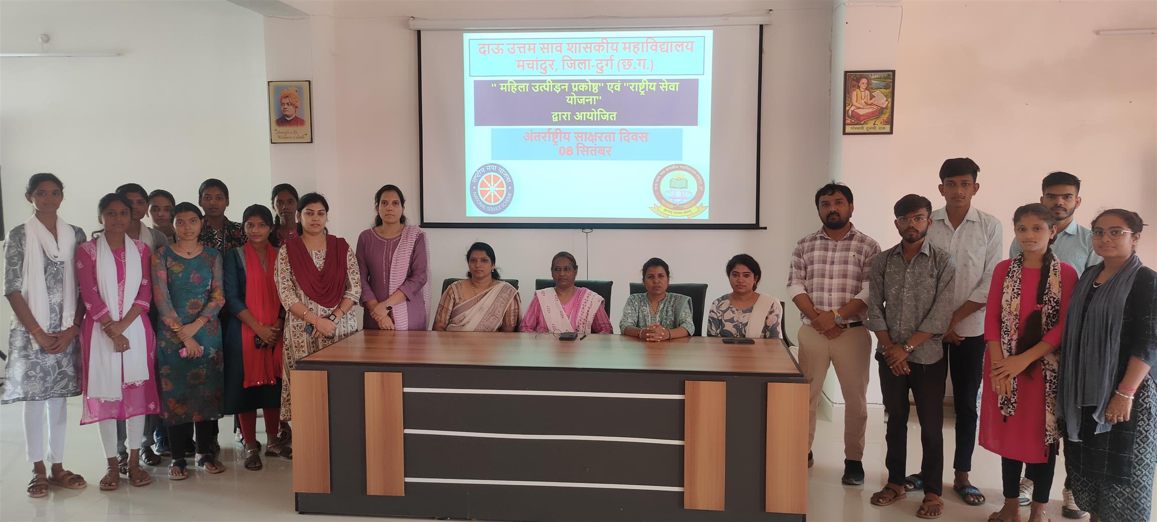 दाऊ उत्तम साव शासकीय महाविद्यालय मचांदुर जिला दुर्ग छग की "राष्ट्रीय सेवा योजना इकाई" एवं "महिला उत्पीड़न प्रकोष्ठ" के संयुक्त तत्वावधान में कार्यक्रम आयोजित किया गया। इस कार्यक्रम में महाविद्यालय के समस्त छात्र-छात्राओं को राष्ट्रीय सेवा योजना के कार्यक्रम अधिकारी श्री विकास कुमार द्वारा अंतर्राष्ट्रीय साक्षरता दिवस को मनाये जाने के पीछे उद्देश्य एवं उसके महत्व को बताया गया। इसके अंतर्गत साक्षरता दिवस की आधारशिला एवं साक्षरता संबंधित मुख्य नारों पर प्रकाश डालते हुए कार्यक्रम में उपस्थित समस्त विद्यार्थियों एवं सदस्यों को अंतर्राष्ट्रीय साक्षरता दिवस की प्रतिज्ञा पर आधारित शपथ भी ग्रहण कराई गई। कार्यक्रम की अध्यक्ष महाविद्यालय की प्राचार्य डॉ.संगीता मेहूरिया ने अपने उद्बोधन में कहा कि बालिकाओं को शिक्षा को अपना मूल हथियार बनाने की आवश्यकता है। इसके पश्चात प्रोजेक्टर के माध्यम से छात्र-छात्राओं को मानव सभ्यता के विकास क्रम पर आधारित लघु चलचित्र भी दिखाया गया। इस कार्यक्रम में महाविद्यालय के समस्त प्राध्यापक गण एवं बड़ी संख्या में छात्र-छात्राएं उपस्थित रहे।