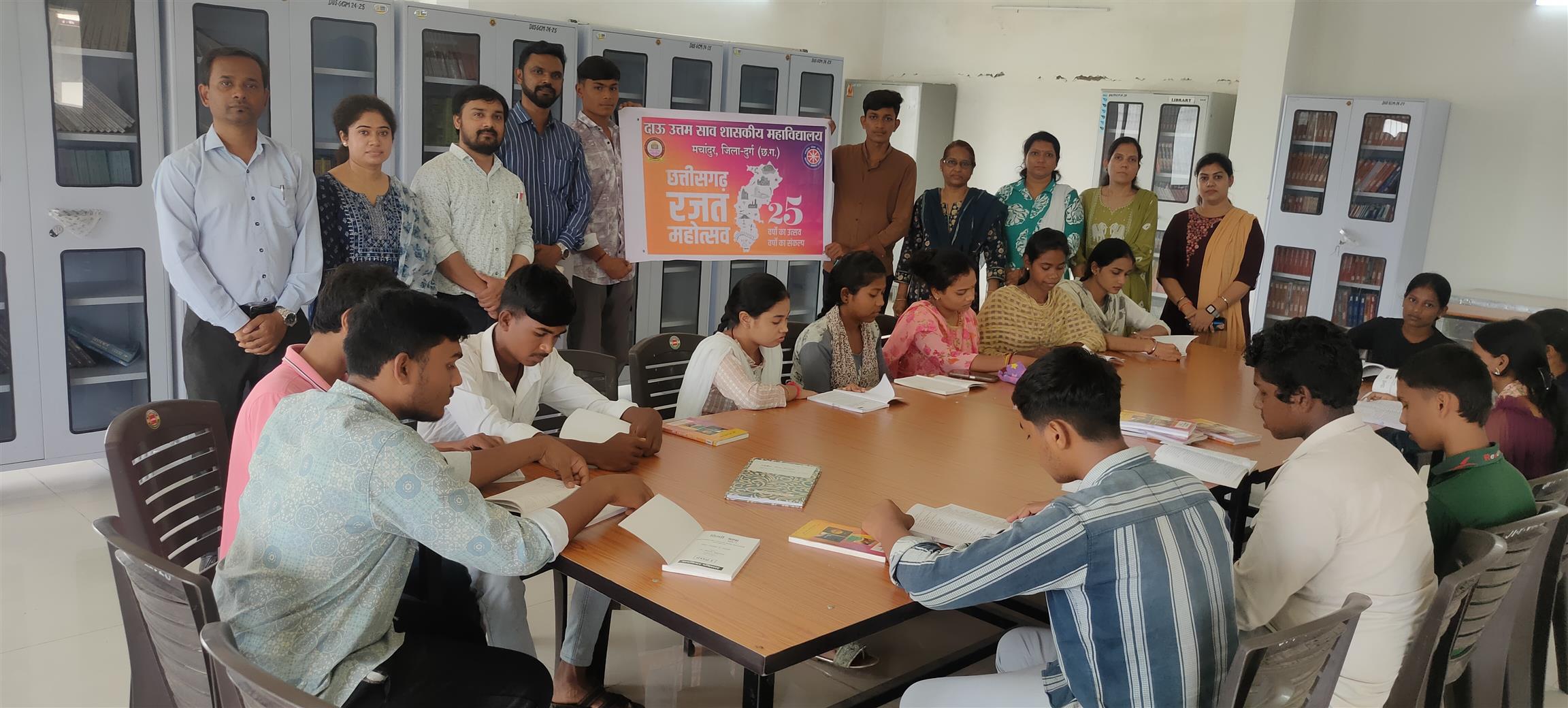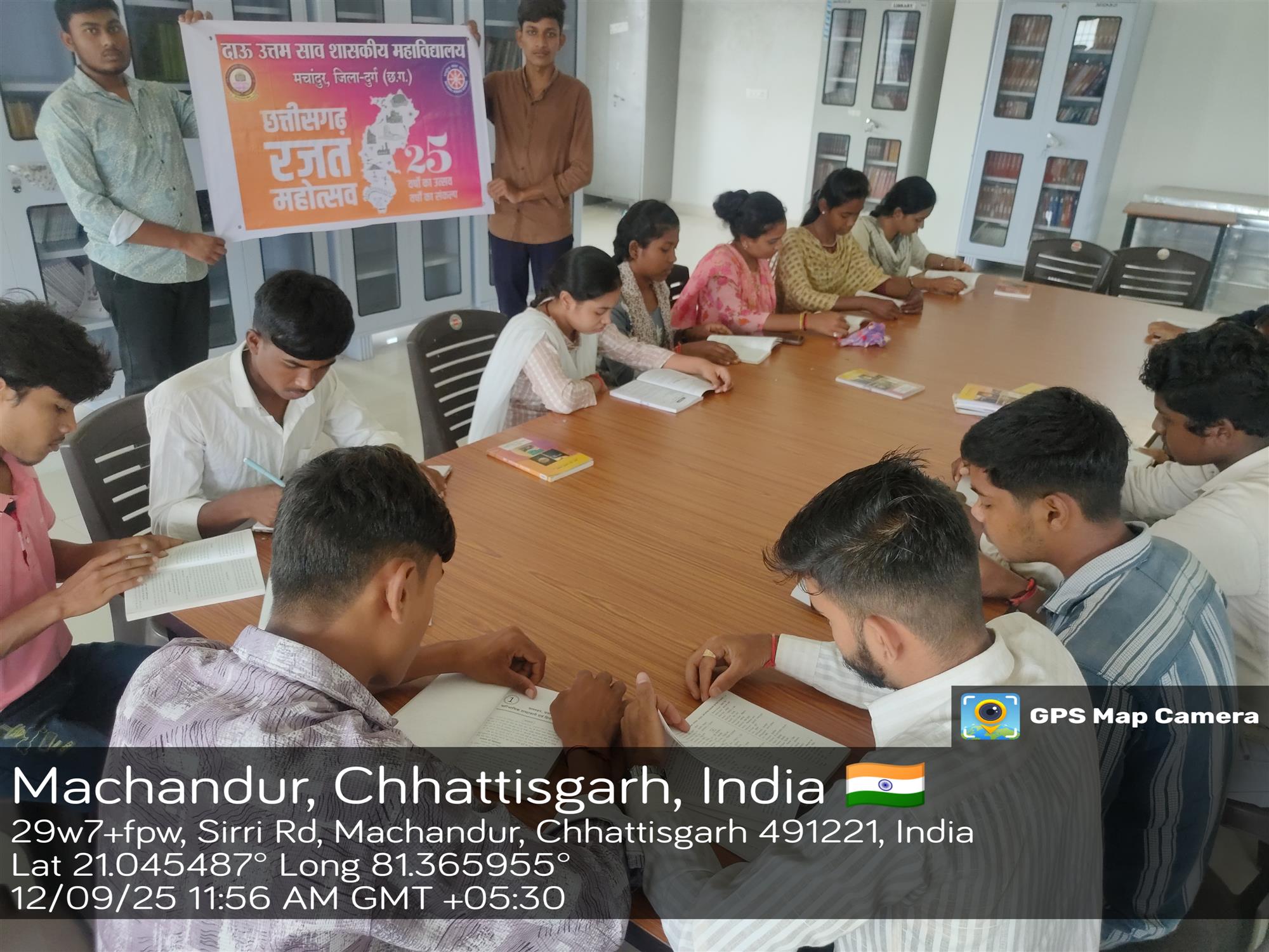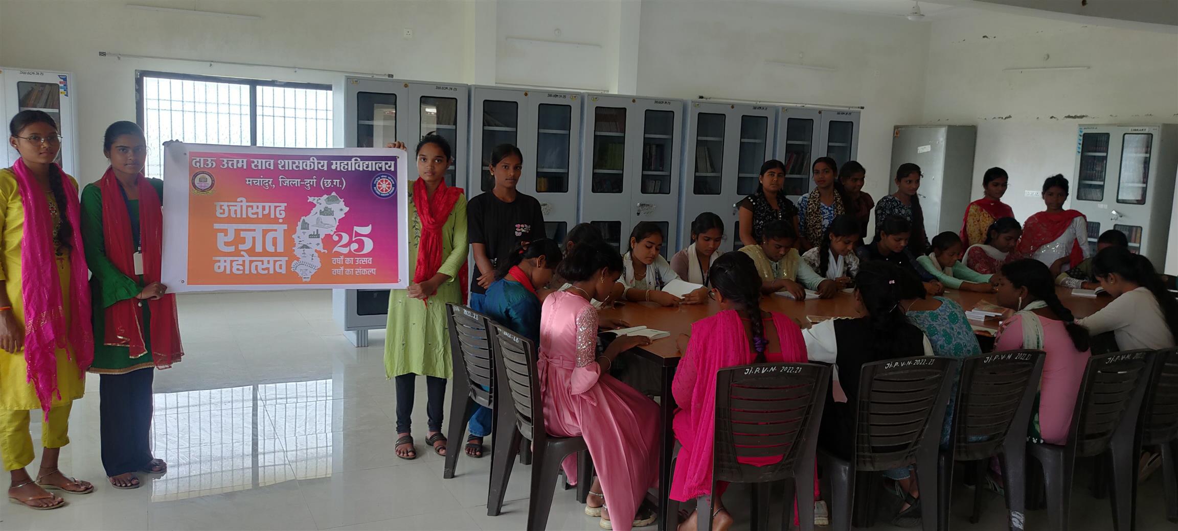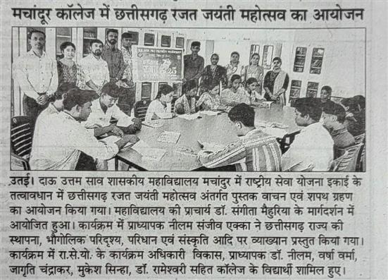 दाऊ उत्तम साव शासकीय महाविद्यालय मचांदूर जिला दुर्ग छ.ग. में राष्ट्रीय सेवा योजना इकाई के तत्वाधान में छत्तीसगढ़ रजत जयंती समारोह अंतर्गत पुस्तक वाचन एवं शपथ ग्रहण का आयोजन किया गया। महाविद्यालय की प्राचार्य डॉ.संगीता मैहूरिया के मार्गदर्शन में आयोजित इस कार्यक्रम में प्राध्यापक श्री नीलम संजीव एक्का द्वारा छत्तीसगढ़ राज्य की स्थापना, भौगोलिक परिदृश्य, परिधान एवं संस्कृति आदि पर व्याख्यान प्रस्तुत किया गया। इस कार्यक्रम में रा.से.यो. के कार्यक्रम अधिकारी श्री विकास, प्राध्यापक डॉ. नीलम, वर्षा वर्मा, जागृति चंद्राकर, मुकेश सिन्हा, डॉ.रामेश्वरी सहित बड़ी संख्या में छात्र-छात्राएं उपस्थित थे।