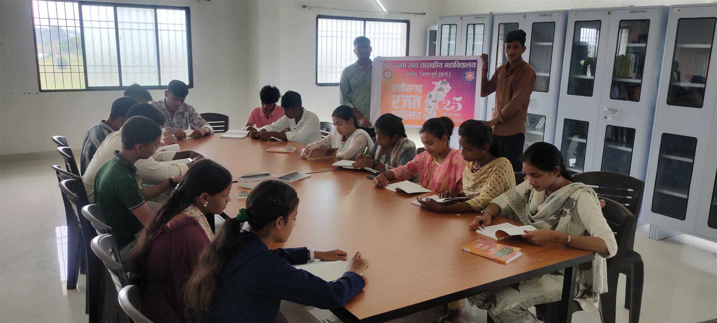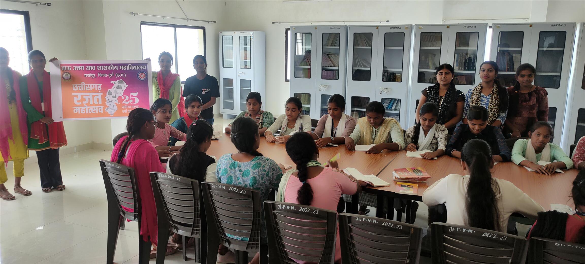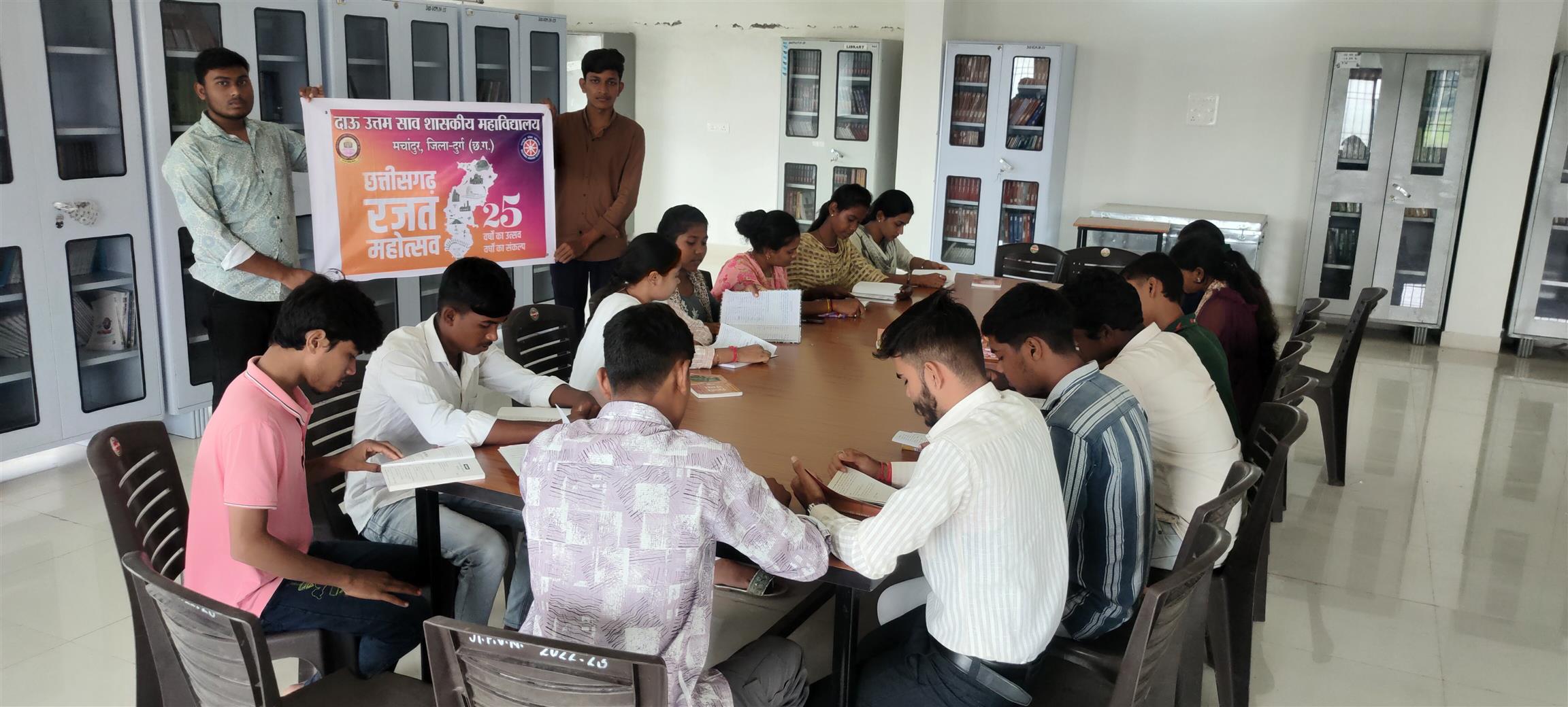 दाऊ उत्तम साव शासकीय महाविद्यालय मचांदूर जिला दुर्ग छ.ग. में राष्ट्रीय सेवा योजना इकाई के तत्वाधान में छत्तीसगढ़ रजत जयंती समारोह अंतर्गत पुस्तक वाचन एवं शपथ ग्रहण का आयोजन किया गया। महाविद्यालय की प्राचार्य डॉ.संगीता मैहूरिया के मार्गदर्शन में आयोजित इस कार्यक्रम में प्राध्यापक श्री नीलम संजीव एक्का द्वारा छत्तीसगढ़ राज्य की स्थापना, भौगोलिक परिदृश्य, परिधान एवं संस्कृति आदि पर व्याख्यान प्रस्तुत किया गया। इस कार्यक्रम में रा.से.यो. के कार्यक्रम अधिकारी श्री विकास, प्राध्यापक डॉ. नीलम, वर्षा वर्मा, जागृति चंद्राकर, मुकेश सिन्हा, डॉ.रामेश्वरी सहित बड़ी संख्या में छात्र-छात्राएं उपस्थित थे।