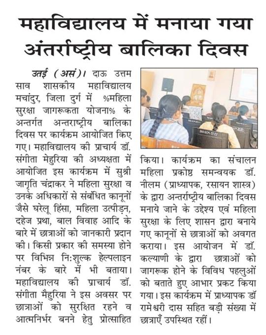 दाऊ उत्तम साव शासकीय महाविद्यालय मचांदुर, जिला दुर्ग में दिनांक 11.10.2025 को 'महिला सुरक्षा जागरूकता योजना' के अन्तर्गत अन्तराष्ट्रीय बालिका दिवस पर कार्यक्रम आयोजित किए गए। महाविद्यालय की प्राचार्य डॉ. संगीता मेहुरिया की अध्यक्षता में आयोजित इस कार्यक्रम में सुश्री जागृति चंद्राकर ने महिला सुरक्षा व उनके अधिकारों से संबंधित कानूनों जैसे घरेलू हिंसा, महिला उत्पीड़न, दहेज प्रथा, बाल विवाह आदि के बारे में छात्राओं को जानकारी प्रदान की। किसी प्रकार की समस्या होने पर विभिन्न निःशुल्क हेल्पलाइन नंबर के बारे में भी बताया। महाविद्यालय की प्राचार्य डॉ. संगीता मैहुरिया ने इस अवसर पर छात्राओं को सुरक्षित रहने व आत्मनिर्भर बनने हेतु प्रोत्साहित किया। कार्यक्रम का संचालन महिला प्रकोष्ठ समन्वयक डॉ. नीलम (प्राध्यापक, रसायन शास्त्र) के द्वारा अन्तर्राष्ट्रीय बालिका दिवस मनाये जाने के उद्देश्य एवं महिला सुरक्षा के लिए शासन द्वारा बनाये गए कानूनों से छात्राओं को अवगत कराया। इस आयोजन में डॉ. कल्याणी के द्वारा छात्राओं को जागरूक होने के विविध पहलुओं को बताते हुए आभार प्रकट किया गया। इस कार्यक्रम में प्राध्यापक डॉ रामेश्वरी दास सहित बड़ी संख्या में छात्राएँ उपस्थित रहीं।