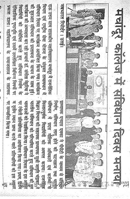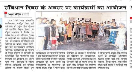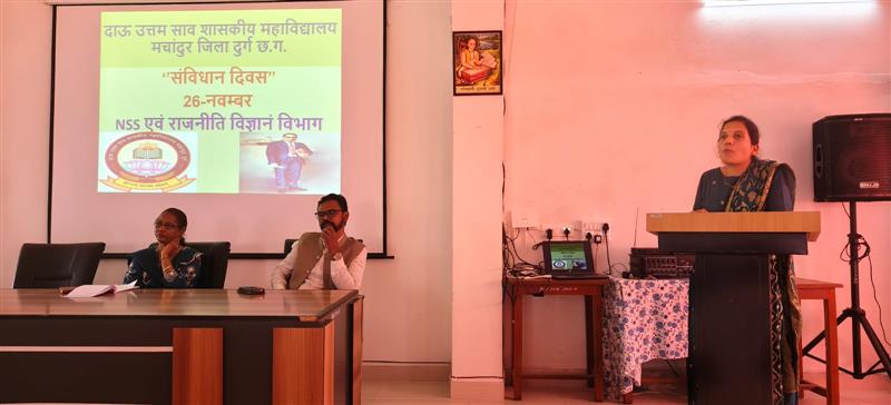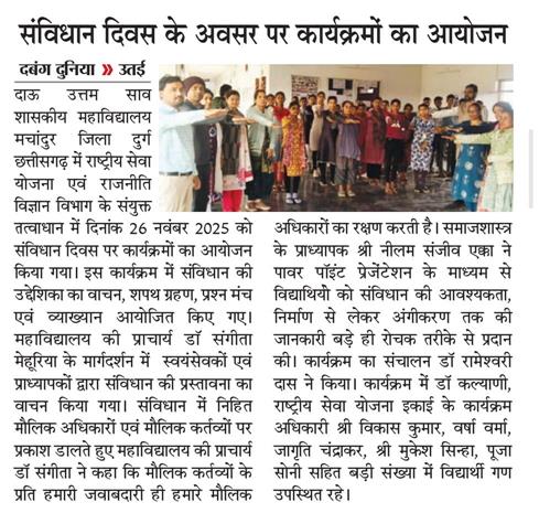 दाऊ उत्तम साव शासकीय महाविद्यालय मचांदुर जिला दुर्ग छत्तीसगढ़ में राष्ट्रीय सेवा योजना एवं राजनीति विज्ञान विभाग के संयुक्त तत्वाधान में दिनांक 26 नवंबर 2025 को संविधान दिवस पर कार्यक्रमों का आयोजन किया गया। इस कार्यक्रम में संविधान की उद्देशिका का वाचन, शपथ ग्रहण, प्रश्न मंच एवं व्याख्यान आयोजित किए गए। महाविद्यालय की प्राचार्य डॉ संगीता मेहूरिया के मार्गदर्शन में स्वयंसेवकों एवं प्राध्यापकों द्वारा संविधान की प्रस्तावना का वाचन किया गया। संविधान में निहित मौलिक अधिकारों एवं मौलिक कर्तव्यों पर प्रकाश डालते हुए महाविद्यालय की प्राचार्य डॉ संगीता ने कहा कि मौलिक कर्तव्यों के प्रति हमारी जवाबदारी ही हमारे मौलिक अधिकारों का रक्षण करती है। समाजशास्त्र के प्राध्यापक श्री नीलम संजीव एक्का ने पावर पॉइंट प्रेजेंटेशन के माध्यम से विद्यार्थियो को संविधान की आवश्यकता, निर्माण से लेकर अंगीकरण तक की जानकारी बड़े ही रोचक तरीके से प्रदान की। कार्यक्रम का संचालन डॉ रामेश्वरी दास ने किया। कार्यक्रम में डॉ कल्याणी, राष्ट्रीय सेवा योजना इकाई के कार्यक्रम अधिकारी श्री विकास कुमार, वर्षा वर्मा, जागृति चंद्राकर, श्री मुकेश सिन्हा, पूजा सोनी सहित बड़ी संख्या में विद्यार्थी गण उपस्थित रहे।